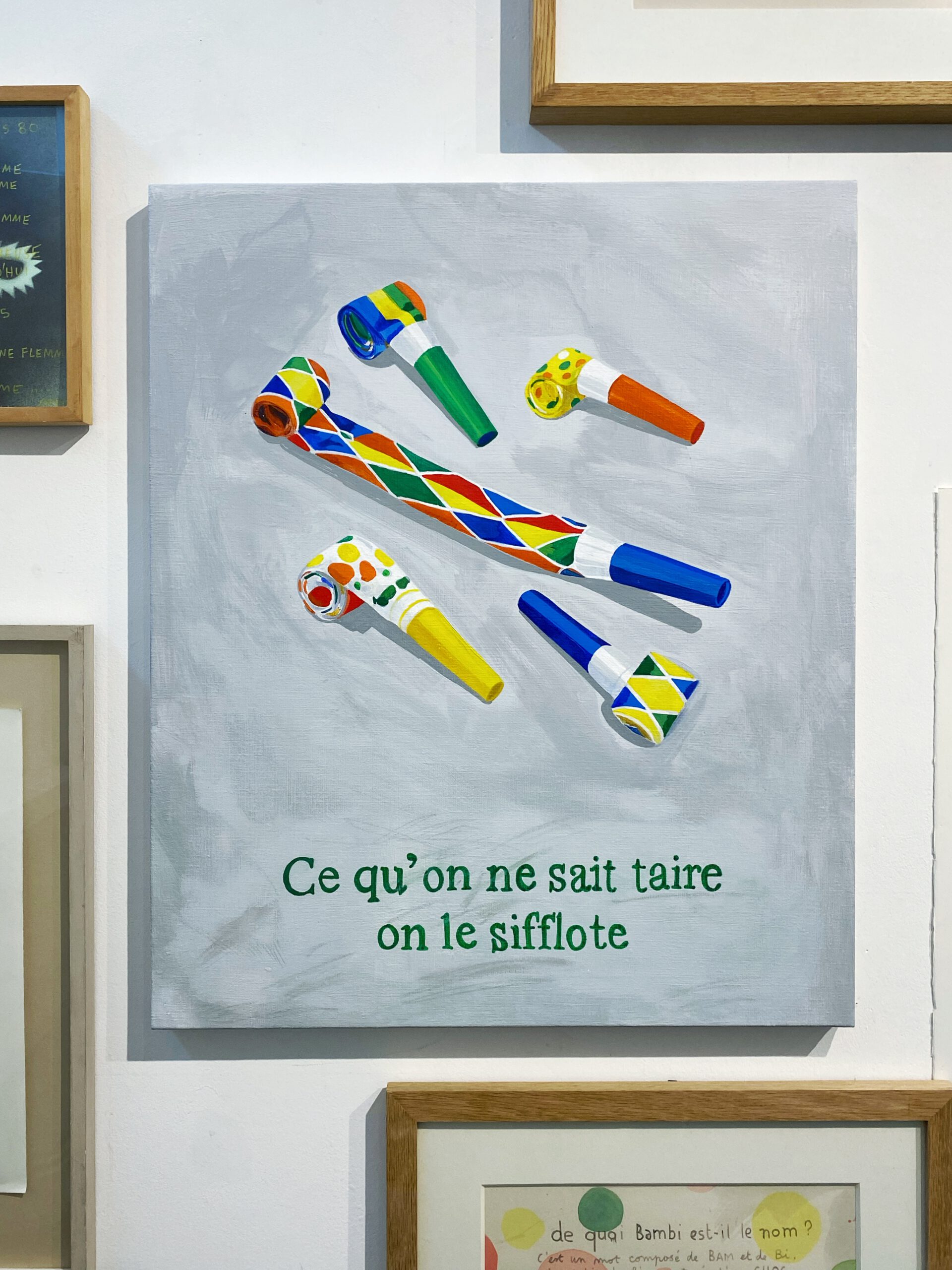 Solfège de l’objet sonore est le titre de la théorie musicale de Pierre Schaeffer qui proposait à partir de 1955 un classement des objets sonores dans une typologie précise. J’ai élaboré une composition qui s’y réfère dans l’exposition Wall of sound qui explore les liens entre la musique et les arts plastiques proposée par Mathieu Weiler. Je propose une composition murale qui cite Guido d’Arezzo, l’inventeur de la solmisation (pourquoi le nom des notes est DO RÉ MI…? ), Arthur Rimbaud dans une prononciation anglaise, Louis de Funès et ses tics de langue, une citation de Wittgenstein réécrite en partie et illustrée, l’araponga, oiseau amazonien qui émet un cri strident champion du record en décibels (dépasse la tronçonneuse), une liste des chansons qui comportent le mot femme dans leur titre, un rêve que j’ai fait à propos de solfège, la phrase la plus longue écrite en notes de musiques…